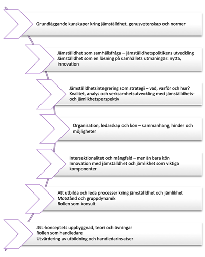 En process- och handledarutbildning för dig som ska arbeta med jämställdhet och jämställdhetsintegrering, som strategi och praktisk verksamhetsutveckling, utbildning, ledning och styrning.